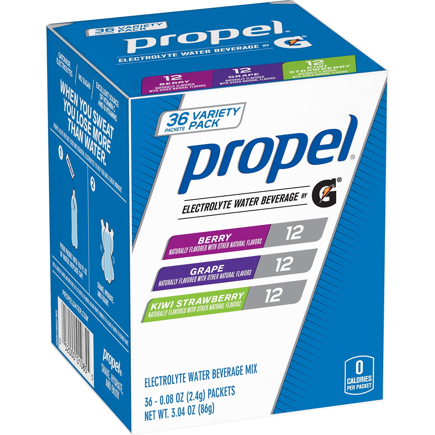 Amazon.com: Propel Powder Packets, 3 Flavor Variety Pack, Electrolytes ... Includes 50 Propel Powder Packets: (20) Watermelon, (20) Black Cherry, and (10) Grape How Gatorade does water, with Gatorade electrolytes to put back what you lose in sweat Propel provides electrolytes and is an excellent source of vitamin B and antioxidant vitamins C and E