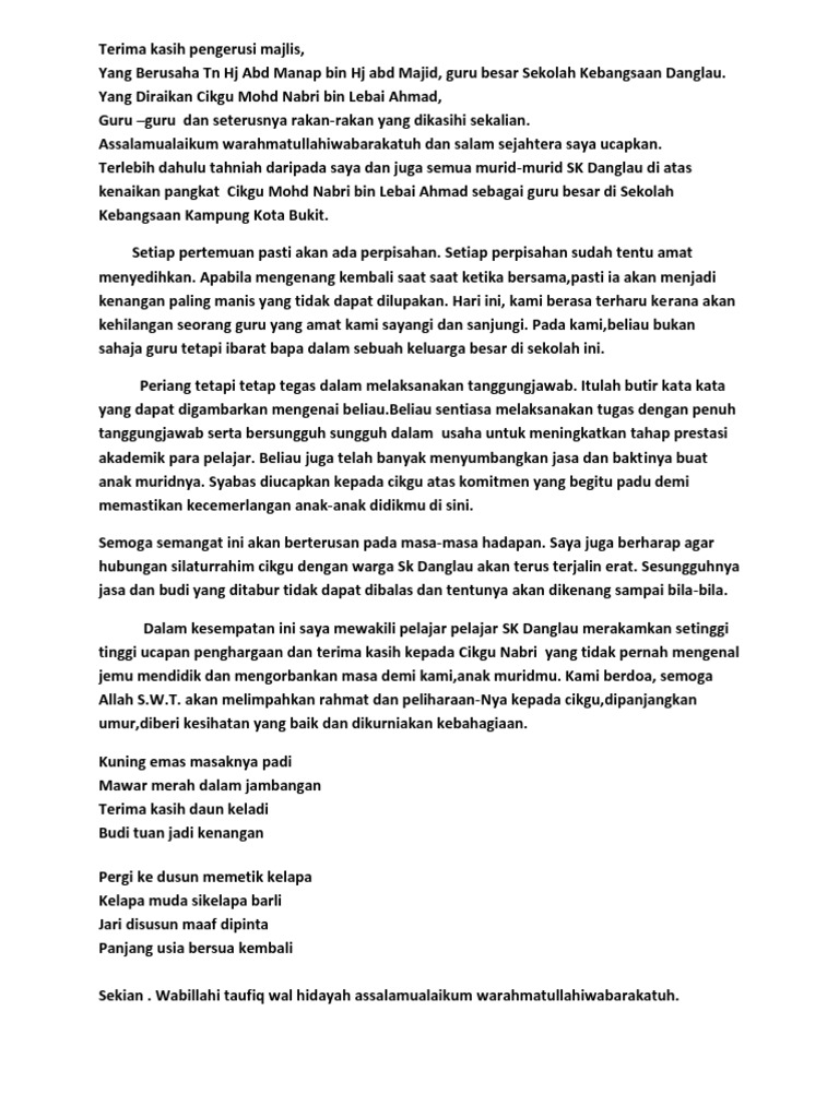 15 Kata Kata Mutiara Guru Perpisahan - setiabijak02 15 Kata Kata Mutiara Guru Perpisahan. April 20, 2022. Kata Mutiara Guru Perpisahan. Karena seorang guru pun selalu mengajarkan kita untuk menghafal dan mengingat bukan untuk melupakan. Perpisahan memang tak akan pernah mudah karena sifat dasar manusia ingin memiliki bukan melepaskan 47. Memberi Dan Meminta Maaf Kata Kata Pesan Untuk Anak ... Contoh Teks Ucapan Perpisahan Kerja - 40 Pantun Perpisahan Kerja ... Sebelum resign kamu harus mempersiapkan kata kata perpisahan kerja kepada rekan kerja kamu, atasan kamu dan klien atau user. ١ ذو الحجة ١٤٤٣ هـ. ... 40 Pantun Perpisahan Kerja Sahabat Lucu Guru. Ucapan ringkas perpisahan rekan kerja kumpulan ucapan from 1001ucapan contoh teks ucapan alu aluan majlis perasmian ucapanku cute766 ... Kumpulan Contoh Kata Sambutan Untuk Perpisahan Guru Berikut ini adalah kata-kata perpisahan untuk guru yang bisa kalian jadikan inspirasi. Terima kasih atas penghormatan ini untuk saya berucap sepatah dua kata dalam majlis meraikan persaraan. Pagi ini masih terasa seperti pagi yang lalu. 55 Kata Perpisahan Sekolah untuk Guru dan Murid Bikin Nangis. 50 Kata-Kata Perpisahan Sekolah untuk Sahabat dan Guru, Bikin Nangis ... Kata Perpisahan. 1. "Jika aku tahu perpisahan sesakit ini, aku lebih memilih untuk tidak mengenalmu sama sekali." BACA JUGA: 90 Quotes tentang Jodoh Penuh Makna dan Doa, Kuatkan Hati dalam Penantian 40 Kata-Kata Pujian untuk Suami yang Romantis, Inspiratif dan Penuh Makna. 2. "Meninggalkan segala kenangan yang telah kita buat bersama itu berat." 3.