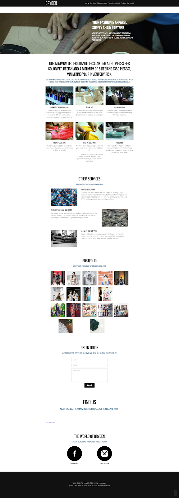 Bryden - Apparel Manufacturing (Singapore / Singapore) | BEAMSTART ... Bryden was started in 2013 to help and serve independent fashion brands and large companies and e-commerce retailers with their sourcing and garment production requirements. We handle the whole supply chain process from designing, creating tech packs, sourcing for fabrics and trims, create samples, bulk apparel production, packaging, quality ...