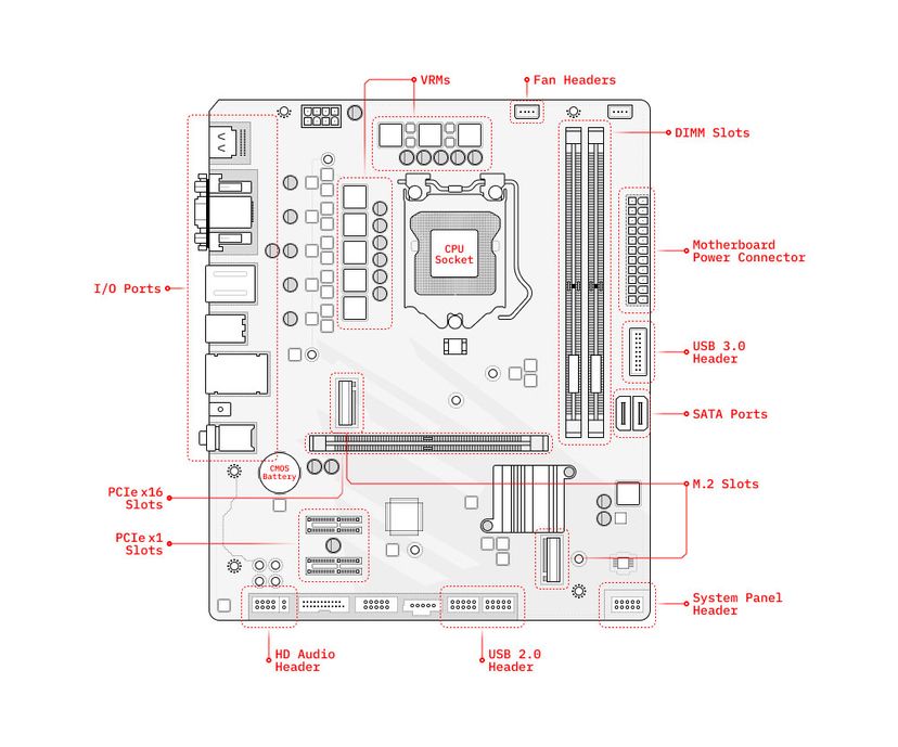Motherboard with labeled parts