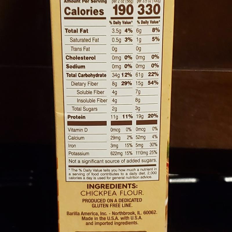 Banza pasta nutrition label. Chickpea Pasta, Prepared calories, carbs & nutrition facts ... 1810 Cal. 190/2000Cal left. Fitness Goals: Heart Healthy. Fat 63.5 g. 3.5/67g left. Sodium 2240 mg. 60/2300mg left. Cholesterol 300 mg. Banza Chickpea Penne Pasta Allergy and Ingredient Information Nutrition Label Nutrition Facts Serving Size 2.00 oz Servings Per Container 4.00 Amount Per Serving Calories 190 Calories from Fat 35 % Daily Value* Total Fat 3.5g 5.38% Saturated Fat 0g 0% Trans Fat 0g Cholesterol 0g 0% Sodium 0.06g 2.5% Total Carbohydrates 32g 10.66% Dietary Fiber 8g 32% Sugars 5g Protein 14g Vitamin A 0% Vitamin C 0% Calcium 4% Banza Chickpea Pasta Macro Nutrition Facts [Food Label Data] Keto & Health Insights for Banza Chickpea Pasta Net Carbs are 13% of calories per serving, at 24g per serving. This meal falls within the range for standard keto diet guidelines (at or under 25g of net carbs). If your daily net carb quota is 25g and if this food almost equals that much, consider whether you're going to eat more food later. Banza Gluten Free Chickpea Penne - 8oz : Target Gluten-Free: Banza pasta is 100% Gluten-Free Certified. Nutrient-Dense: Each serving of Banza pasta has 50% more protein, 3x more fiber, and 25% fewer net carbs than the leading traditional pasta. Loved by picky eaters: Chickpeas make delicious pasta, and Banza looks, cooks, and tastes like traditional pasta. Plant-Based: Powered by Chickpeas ...