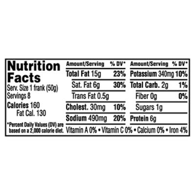 Low Fat Beef Hot Dogs Calories, Carbs & Nutrition Facts - MyFitnessPal Ball Park Low Fat Beef Hot Dogs Serving Size: 1 frank 50g 50 Cal 58% 7g Carbs 0% -- Fat 42% 5g Protein Track macros, calories, and more with MyFitnessPal. Join for free! Daily Goals How does this food fit into your daily goals? Calorie Goal 1950 Cal 50/2000Cal left Fitness Goals: Heart Healthy Fat 67 g --/67g left Sodium 1870 mg 430/2300mg left Calories in Ball Park Original Beef Hot Dogs | CalorieKing 50 minutes Based on a 35 year old female who is 5'7" tall and weighs 144 lbs. Calorie Breakdown Where do the calories in Ball Park Original Beef Hot Dogs come from? 13.7% 9.1% 77.1% Protein Total Carbohydrate Total Fat 180 cal All Beef Hot Dog (With Bun, Ketchup, & Mustard) - MyFitnessPal Ball Park All Beef Hot Dog (With Bun, Ketchup, & Mustard) Serving Size: 1 Hot dog 260 Cal 38% 30g Carbs 48% 17g Fat 14% 11g Protein Track macros, calories, and more with MyFitnessPal. Join for free! Daily Goals How does this food fit into your daily goals? Calorie Goal 1740 Cal 260/2000Cal left Fitness Goals: Heart Healthy Fat 50 g 17/67g left Calories in Ball Park Beef Frank and Nutrition Facts - FatSecret Ball Park Beef Frank Nutrition Facts Serving Size 1 frank (53 g) Amount Per Serving Calories 170 % Daily Values* Total Fat 15.00g 19% Saturated Fat 6.000g 30% Trans Fat 1.000g Cholesterol 30mg 10% Sodium 480mg 21% Total Carbohydrate 4.00g 1% Dietary Fiber 0.0g 0% Sugars 1.00g Protein 6.00g Vitamin D - Calcium 0mg 0% Iron 0.80mg 4% Potassium 280mg