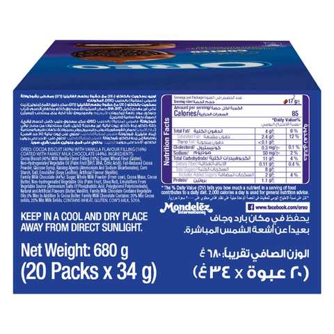 Oreo Cookies - Nutrition Label Jan 11, 2018 ... INGREDIENTS: NABISCO OREOS (UNBLEACHED ENRICHED FLOUR (WHEAT FLOUR, NIACIN, REDUCED IRON, THIAMINE MONONITRATE \, RIBOFLAVIN \, FOLIC ACID), ... Oreo Cookie Original 274G - Woolworths Wheat Flour, Sugar, Vegetable Oil (contains Antioxidant (319)), Cocoa Powder, Fructose Syrup, Cornstarch, Raising Agents (500, 503), Salt, Emulsifier (Soy ... Nutrition Label - University of North Dakota Oreo Cookies INGREDIENTS: NABISCO OREOS (UNBLEACHED ENRICHED FLOUR (WHEAT FLOUR, NIACIN, REDUCED IRON, THIAMINE MONONITRATE \, RIBOFLAVIN \, FOLIC ACID), SUGAR, PALM AND/OR CANOLA OIL, COCOA (PROCESSED WITH ALKALI), HIGH FRUCTOSE CORN SYRUP, LEAVENING (BAKING SODA AND/OR CALCIUM PHOSPHATE), SALT, SOY LECITHIN, CHOCOLATE, ARTIFICIAL FLAVOR. }) Calories in Oreos - Nutritionix Dietary Fiber 0.4g 1%. Sugars 4.9g. Protein 0.6g. Vitamin D 0mcg 0%. Calcium 2.5mg 0%. Iron 1.5mg 8%. Potassium 28.1mg 1%. Caffeine 0.6mg. The % Daily Value (DV) tells you how much a nutrient in a serving of food contributes to a daily diet. 2000 calories a day is used for general nutrition advice.